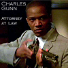 Description: Gunn in a suit, holding a shotgun, with text "Charles Gunn: attorney at law"