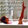Description: Faith in Buffy's body, in a bubble bath, with text "Please, do keep explaining how Fuffy isn't canon."